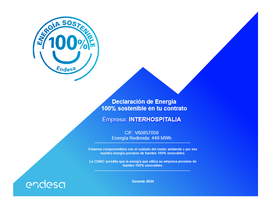 En 2024 Interhospitalia2 AIE ha redimido 449 MWh a través de su instalación de energia solar y se certifica que el 100% de la energia consumida provino de Fuentes 100% renovables.